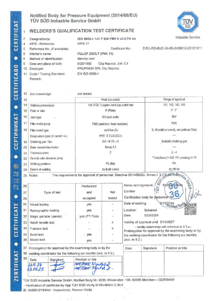 De peste 20 de ani suntem prezenți pe piața românească, iar succesul Profinox se bazează pe un angajament ferm față de calitate, inovație și siguranță. Portofoliul nostru cuprinde acreditări naționale și internaționale care atestă competența și conformitatea proceselor de prelucrare a oțelurilor inoxidabile: sudură automatizată, debitare cu laser de înaltă precizie, îndoire CNC, sudură TIG/MIG și multe altele.
